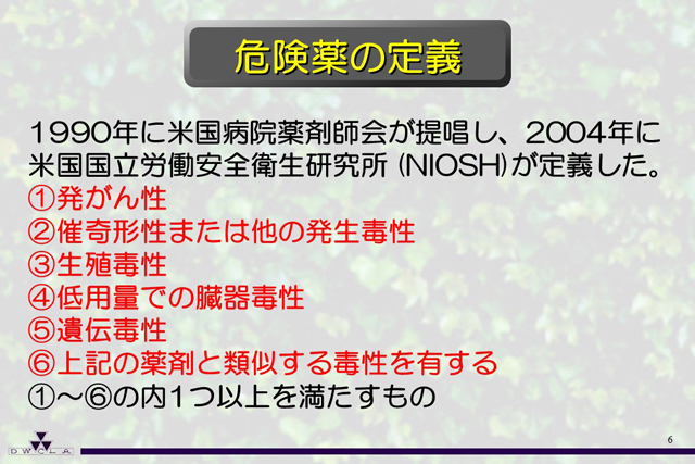 海外では1981年オーストラリアとカナダ病院薬剤師会以降、各種のマニュアルやガイドラインが出ていますが、私達が注目したのは2004年NIOSH勧告です。当時日本病院薬剤師会でも調製マニュアルを作成していましたが、この勧告が公表され、構造抄読からやり直したという記憶があります。勧告では「危険薬は危険と認識しながら取り扱っていく」としており、むやみに怖がる必要はありませんが、その危険性を理解し、対処することが重要だと思います。