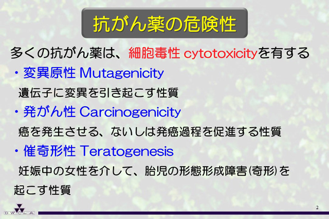 抗がん剤の多くは細胞毒性を有し、その危険性には「変異原性:染色体異常」「発がん性:がんの発生もしくは発がん過程を促進する性質」「催奇形性:妊娠中の女性を介して、胎児形態形成障害を引き起こす性質」があります。
