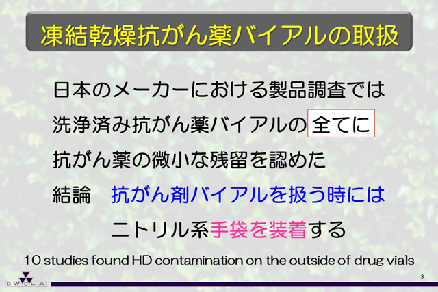 抗がん剤のバイアル外面は汚染されていることが知られています。実際に測定してみるとナノグラム単位の濃度では3割ぐらい、その1/1000単位のピコグラム単位で調べると全てのバイアルが汚染されているというデータもあります。必ずニトリル系の手袋を装着して取り扱う必要があります。