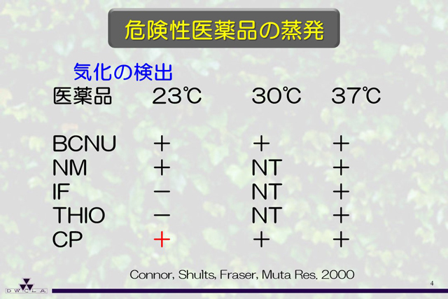 日本では2005年に日病薬から「抗がん剤調製マニュアル」、2007年に日本がん看護学会から「抗がん剤取扱いマニュアル」が出され、2008年に我々が日病薬で策定した「注射剤・抗がん薬無菌調製ガイドライン」が出され、先ほどご紹介のあった2014年厚労省課長通知にて「抗がん剤曝露対策の実施」が通達されましたが、そこには罰則規定はなく、診療報酬加算も薬剤調製用器具しかないのが現状です。