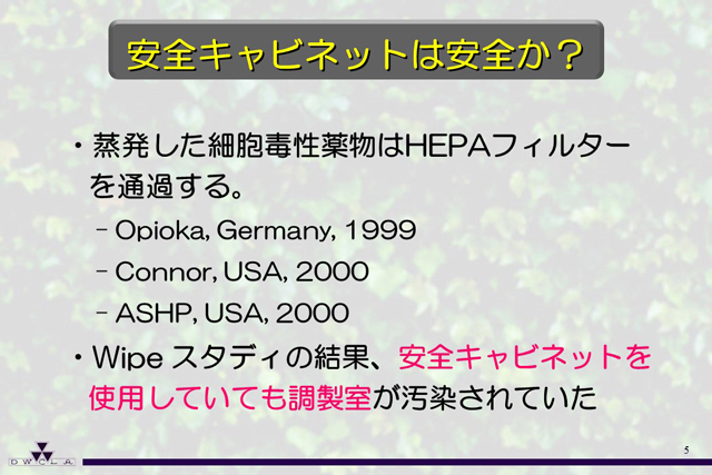 現在、抗がん剤をトラップするフィルターを備え、オゾンガスの併用により、キャビネット内外に気化した抗がん剤が漏れないようにする安全キャビネットが経産省の肝いりで発売され、さらにオゾン水により点滴バッグ外面を洗浄するような装置も付加されていますが、今後はそのような安全キャビネットに代わっていくのではないかと思います。