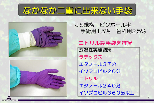 JIS規格での医療用手袋のピンホール率は1.5~2.5%とされており、言い換えれば医療用手袋の約2%はピンホールが空いている可能性があります。これを考えると手袋は二重にすべきです。さらに、エタノールやIPAの浸透性から見てもニトリル製が有効とされています。