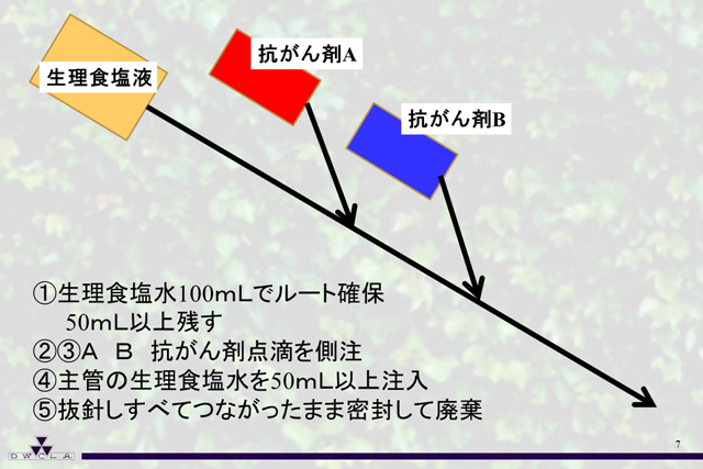 通常はカテーテルに薬剤を入れた後に、ほぼ同量で洗浄されていると思います。データではこの方法で効果があることが示されていますので、実施すべきですが、重要なのは洗浄してもチューブ内には抗がん剤は残っており、またカテーテルチップ上には存在しますので、曝露対策を十分に取る必要があります。さらにその剤形によっても抗がん剤の曝露の量は異なりますので、その点も考慮に入れるべきと考えます。
