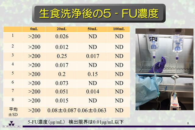 抜針前の生理食塩水などでのセット内の洗浄ですが、ほとんどの施設で50mLの投与後に抜針されていると思います。これも5-FUを用いて実験で調べたところ、20mLでも結構低い濃度になりますが、50mLであれば測定限界以下のケースもあることから、50mLで良いということになります。