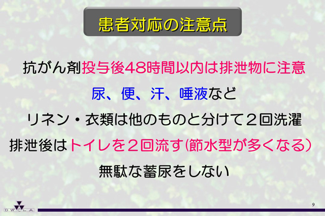 患者さんの対応機会が多い看護師さんですので、化学療法を受けた患者さんの排泄物は、投与後48時間は気を付けてください。トイレも最近は節水型のトイレが増えていますので、きちんと2回流すことが必要です。トイレの蓋も、ノロウイルス対策でもそうですが、きちんと蓋をして流すようにすべきと考えます。