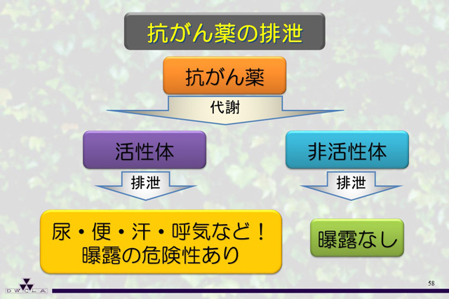 抗がん剤の代謝後の物質が活性体であれば危険です。さらに、薬剤の排泄期間のデータも示されており、薬剤師であれば知っていますので、自院の薬剤師の先生を活用してください。