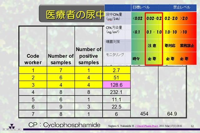 曝露対策実施前の医療者のシクロホスファミドの尿中からの検出データを示します。1は外来の看護師さんで、手袋を使っていた人です。2は外来の看護師さんで手袋を使っていなかった人、3は、いまはどの施設でも行われていないと思いますが、血液内科病棟で手袋をせずに調製を行っていた人です。海外で出ている危険度を示すデータでは「注意が必要」というレベルにあり、やはり十分な曝露対策が必要であることがわかります。