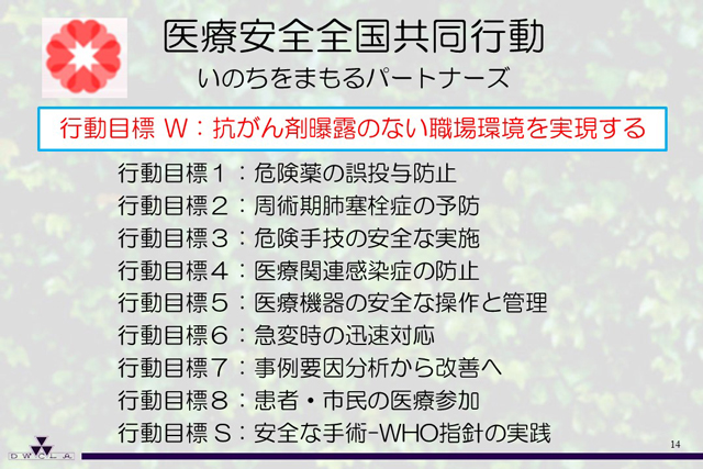 2014年に抗がん剤曝露対策協議会が設立され、活動を続けています。医療安全全国共同行動の行動目標Wに「抗がん剤曝露のない職場環境を実現する」ことが入りました。そのツールとしてチェックリストを作成しています。医療安全全国共同行動に入会されている施設ではご覧になることができます。定期的にチェックリストを確認していただき、できていない課題は、病院管理者に訴え、是非実現していただければと考えます。ある病院の機能評価において「化学療法を行わない患者と同じ部屋で、がん患者の化学療法を行うことは如何なものか?」という質問があったと聞いており、そのような時代になってきました。
