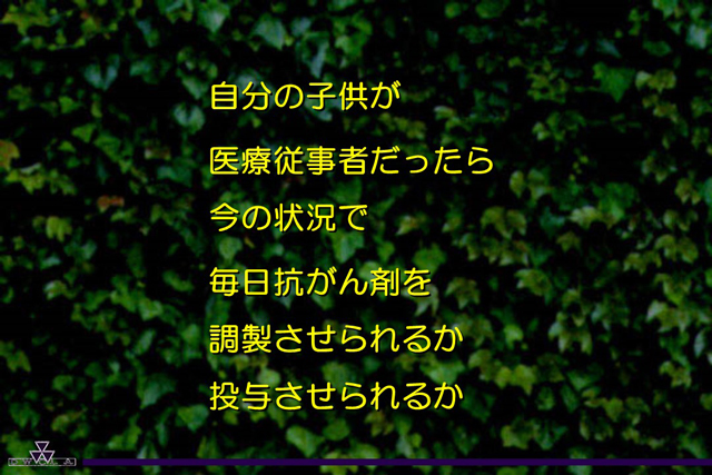 「自分の子供たちが、医療従事者だったら今の状況で毎日抗がん剤を調製させられるか?投与させられるか?」、このことを考えながら、抗がん剤の曝露対策に取り組んでいただければよいのではと思います。