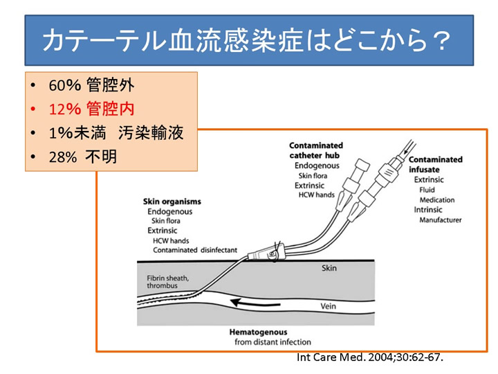 輸液ラインからの感染リスクはどのくらいあるでしょうか。まだNCが開発されていなかった1985年のデータでは側注デバイスからの汚染率は70%、刺入部汚染、薬液汚染、カテ先からの血行性播種がそれぞれ10%となっています(図1)。カテーテル血流感染症がどこから来るかというデータ(2004年)では、管腔外が60%、管腔内が12%となっていて(図2)、ハブが汚染されて回路中に菌が侵入することが危惧されます。