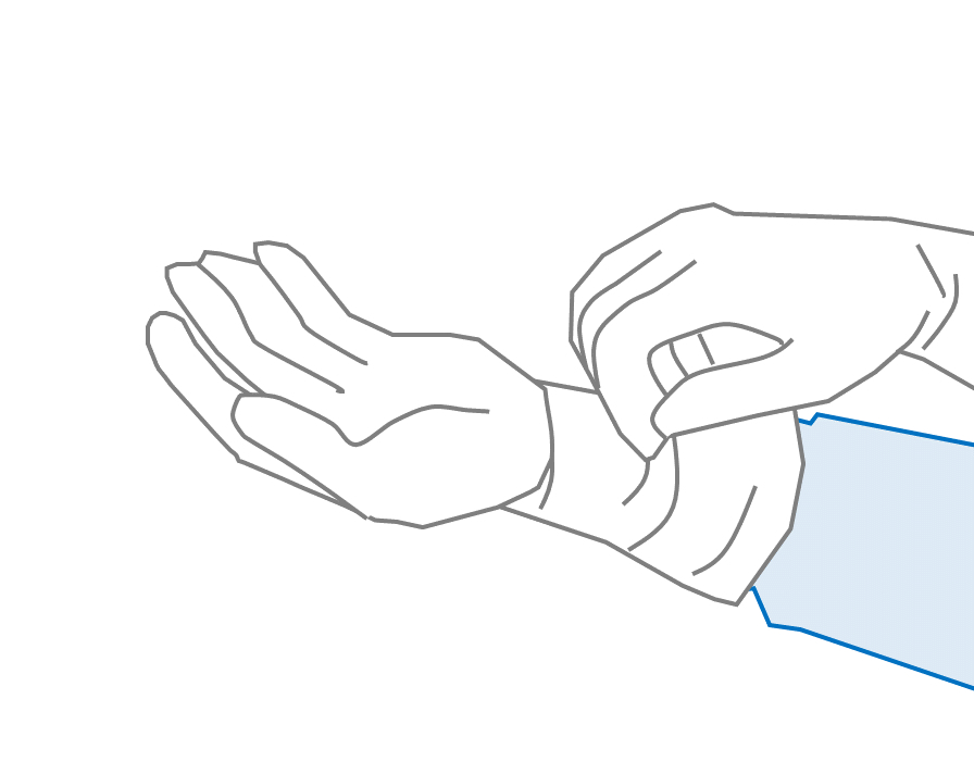 ④ 滅菌ガウンの袖口に、手袋の折り返した袖口部分をかぶせます。 その際、装着した手袋が素肌に触れないようにします。 |