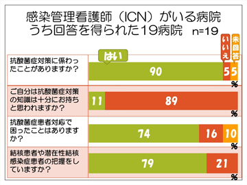 昨年度群馬県内医療施設における結核対策の実情についてのアンケートを実施しました。ほとんどの施設が結核マニュアルを用意し、結核に対する研修は6割近い施設が行っていました。結核患者の治療経験があるのは4割程度、DOTSを実施しているのは16%にとどまりました。ICNへの質問では図1の結果でした。