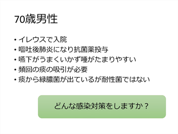 この患者さんに対して、皆さんの施設ではどのような感染対策をしますか。私は、接触感染対策を行い、フェイスシールド付マスク・エプロン・手袋を装着して痰を吸引するのが理想と考えています。なぜならば痰から非耐性菌の緑膿菌が出ているものの全菌を把握しているわけではなく、いつ耐性菌を獲得して痰を出すかわからないからです。個室が用意できるのであれば、標準予防策でも痰吸引時だけPPEを装着すればよいでしょう。