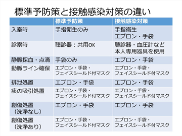 標準予防策はすべての患者さんに行い、体液曝露を鑑みてPPEレベルを変えるものです。接触感染対策は環境中に接触感染する可能性の菌がたくさんいるという想定のもと、そのエリアに入る時点でPPEを装着するものです。この標準予防策と接触感染対策の違いをよく理解しておくことが大切です(図1)。