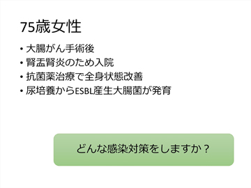 症例2で検出されたESBL産生菌の日本での検出頻度は約10%で、健常人からも検出されています。ですから、ESBL産生菌が検出されただけで隔離するには容量オーバーで難しい状況になっています。当院では、喀痰が多くない、ドレーン刺入部などからの漏れがない、排泄が自立しているという条件を満たせばESBL産生菌を保有していても標準予防策の徹底で対処しています。