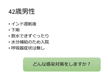 この場合は、患者さんがもっている菌が明らかになるまでは標準予防策に加え、接触感染対策を行うのが理想です。というのは、世界で新規に問題になる耐性菌は日本では帰国者が第一例として発見されることが多いからです。