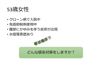 免疫不全者の帯状疱疹は、最初は局所的に見えても後に全身に広がったり、肺炎や膵炎などの病変を伴う場合があります。CDCガイドラインでは、「播種性でないとわかるまでは空気感染対策と接触感染対策を施行する」とされています。当院では次の対策をとっています。