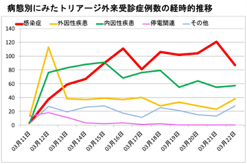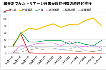 トリアージ外来は12日間開いていました。当初は外傷と低体温の患者が、中盤以降は呼吸器の患者が多くなりました(図1)。