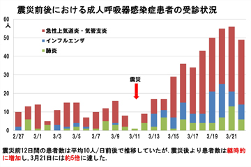 しかし、尿路感染や中耳炎、結腸炎などその他の感染症患者の受診状況は震災前後でそれほど変わりませんでした。