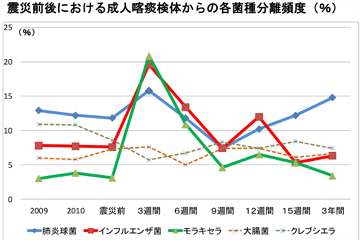 震災前後における成人喀痰検体からの各菌種分離頻度では、震災前には肺炎球菌がいちばん多かったですが、震災後にはインフルエンザ菌と、普段はそれほど多くないモラキセラも急増しました(図4)。