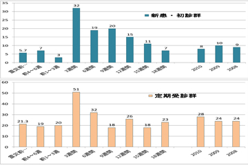 震災後、残存施設に患者さんが集中するのは当然ですが、高度ストレス環境下に置かれると肺炎発症率が上昇することが考えられます。急性期の患者さんを分析したところ、新患・初診群、定期受診群ともに震災後増えています。おそらく震災後はその両方が合わさり、増加したのではないかと思われます(図5)。