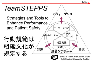 最近、アメリカでは、「Team STEPPS」とよく言われます。患者ケアのチームにはそれぞれ異なる専門知識をもった職種がいて、それぞれのスキルをもって患者さんに接します。そのときに誰がリーダーシップをとっていくか、コミュニケーションがとれているか、相互支援ができているか、状況確認ができているかなどを考えながら医療を提供することが大切です。感染防止対策はそれぞれの施設でどのような組織文化があるか、なければどのような組織文化を創るかにかかっているといっても過言ではありません(図1)。