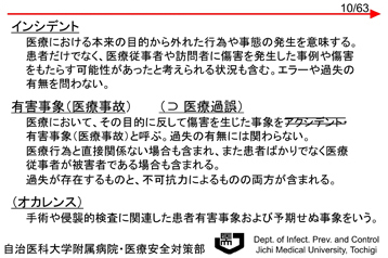 手術や薬の投与の間違いは誰が見ても間違いであるとわかります。それに対して医療関連感染は間違いなのかどうかわかりません。例えば医療従事者が手指衛生をせずに患者さんのところに行き、菌をうつしたとしても、菌は目に見えないし、潜伏期間をおいてから発症するので、結局誰がうつしたかはっきりしません。