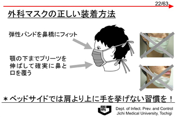 伝染性疾患にかかった職員から院内感染が伝播することもあります。職員に伝染性疾患があり出勤停止にならない場合は、マスクをすることが対策となります。ただし、発症前から感染力を持つ菌もあるので、日ごろからの手指衛生が感染拡大防止には欠かせません。