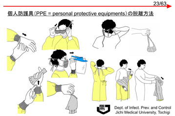 マスクは確実に鼻と口を覆うようにしてください。マスクをつけたり、外したりしてはいけません。つけたり外したりする習慣があると、手が鼻や口に頻回に行ってしまい、かえって危険が増します。ベッドサイドでは肩より上に手を上げないようにしましょう(図3)。個人防護服(PPE)を脱ぐときは、菌が一番多く付着している可能性が高い手袋から、が原則です(図4)。