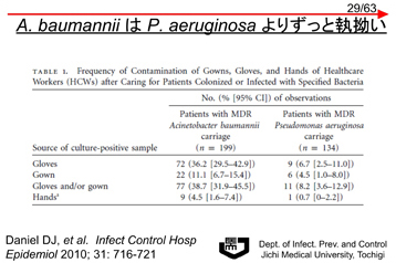 病院環境中に幅広く生息する菌に多剤耐性アシネトバクター(MDRAB)があります。乾燥環境でも長期間にわたって生存できますし、栄養要求度が低く、栄養がない場所でも生きていけます。病棟カーテン、ドアノブ、キーボードなどのほかに、医療従事者の携帯電話が感染源になった例もあります。しかも、多剤耐性緑膿菌よりもしつこいことがわかりました。多剤耐性緑膿菌は、手袋やガウンに付着している割合は8%程度ですが、アシネトバクターは40%にのぼります(図5)。