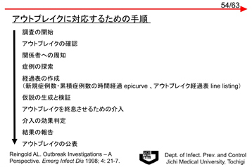 アウトブレイク調査が遅くなると調査に有用なサンプルが得られにくくなる場合が多くあります。臨床検体が破壊されているかもしれませんし、時間が経過してしまった状況で環境調査に意味づけすることは難しくなります。ですからアウトブレイクが発生したら速やかに行うことがポイントです。アウトブレイク調査の結論については法的根拠として採用される可能性もあることを知っておきましょう。