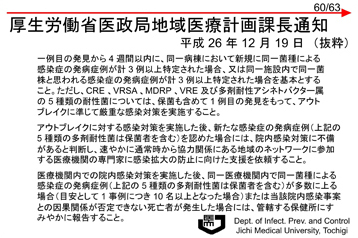 近年増加が問題になってきた耐性菌の一つに、特効薬のないカルバペネム耐性腸内細菌(CRE)があります。KPC型は2008年米国滞在中に白血病を発症した30代の日本人女性が治療のため日本へ転院後、KPC陽性菌保菌が判明したのが本邦第一例です。NDM型は2009年インドから帰国した日本人男性が本邦第一例で、2010年には渡航歴のない90代女性から検出されています。2010年から大阪の病院で検出され、その後も同じ耐性遺伝子を持つ菌の検出が続いたことから、保健所と国立感染症研究所が調査を行いました。その結果、外科と脳外科に集中し、ドレーンや胃管排液、尿の回収に用いられていたプラスチック製容器が施錠・消毒が不十分なまま複数の患者で共用されていたことや、ガーゼ交換等の外科処置における手指衛生が不十分であったことが判明しました。このことからも、手指衛生の徹底がいかに重要か理解いただけると思います。