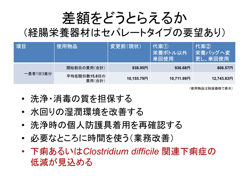 代案1は現状との差はほとんどありませんでした。代案2は現状より、開始日初日の費用は約130円安くなり、平均在院日数15.8日に係る費用は約2,588円高くなることがわかりました。この差額をどうとらえるかですが、ICT(感染防止対策チーム)内で、ラウンドで問題点として挙げられた洗浄・消毒の質を担保する、水回りの湿潤環境を改善する、洗浄時の個人防護具着用を再確認する、必要なところに時間を使う業務改善が必要であること、さらに、下痢あるいはクロストリジウム・ディフィシル(Clostridium difficile)関連下痢症の低減が見込めるという観点から、ICC(感染防止対策委員会)で経腸栄養器材の単回使用導入について提案することを検討しました。