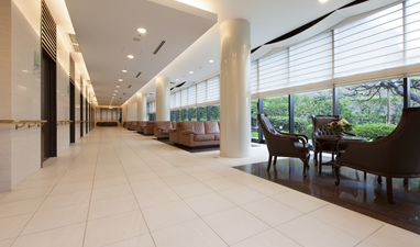 その前理事長がもう一つ強くこだわったのが、病院の建物だ。院内は豪華ホテルのようにゆったりとした上質な空間が広がっていて、医療機関にありがちな無機質さは全くない。待合スペースからは緑豊かな庭園を望むことができ、穏やかな気持ちにさせてくれる。屋上庭園もあり、春と秋にはバラが咲き乱れ、その向こうに瀬戸内海が横たわるという絶景を楽しむことができる。これら全てに、患者にリラックスしてほしいとの前理事長の思いが込められている。