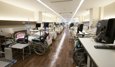 透析室はベッドとベッドの間のスペースにゆとりをもたせ、ゆったりとリラックスできる環境を整えている。また、各患者の生活スタイルに合わせて選択できるよう、腹膜透析や血液透析(HD)、オンラインHDF(血液透析濾過)、在宅血液透析、さらには夜間の睡眠時間を利用して行うオーバーナイト透析を揃えている。また、透析関連装置も積極的に最新バージョンに更新し、透析治療の安全性の確保に努めている。