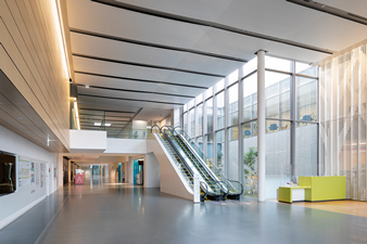 救急外来は建物の北側、ホスピタルストリートの右側に並ぶ検査室と通路を挟んだところにある。その並びにはIVR室や放射線検査室が配置され、救急患者が最短の動線で検査を受けることができる。しかも、治療が終わった患者は専用のエレベーターで2階のICUへ速やかに移動できる。また、400床中、ICU8床、HCU10床、救急病棟のHCU14床、SCU6床、NICU6床が用意されている。