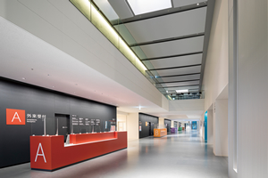 新病院の敷地面積は東京ドームの約1.5個分に当たる7ha。その半分弱が建物で、2階建ての外来棟と6階建ての入院棟で構成されている。外来棟の正面入口を入ると、ホスピタルストリートと呼ばれる広い通路がまっすぐに伸び、右側には検査室、左側には外来診療室が並ぶ。