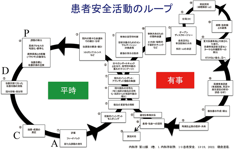 さらに長尾氏は2017年より厚生労働科学研究の班長を務め、実際に求められる患者安全上の実務の全体像について、2年をかけて議論した。その結果、長年考えてきた有事と平時の活動を連動させる、無限ループの形をした医療安全活動の構想をまとめる(図)。