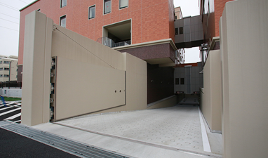 そこで採られた方法がまず、病院建物を道路より高くなるように盛土を行うマウンドアップだ。実際1.5mの盛土を行った。また、建物の周囲には止水のために通常より高い免震擁壁を設け、建物内への水の浸入を防ぐために正面玄関に止水板を設置、物流の車両が出入りする地下入口に高さ2.7mの防潮扉を設置したりと、さまざまな水害対策が講じられた。